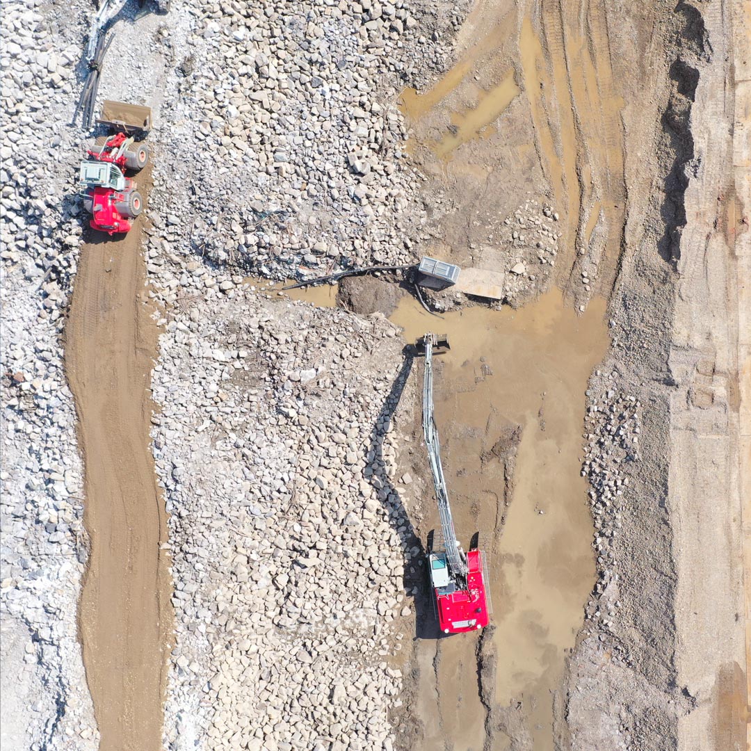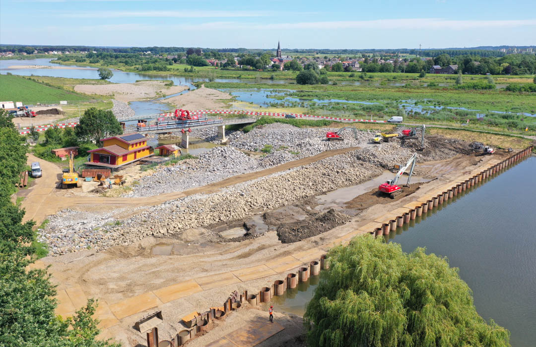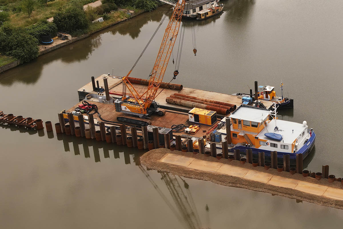 - Een 140 meter lange stalen combiwand met buispalen tot 4m in de mergel plaatsen.