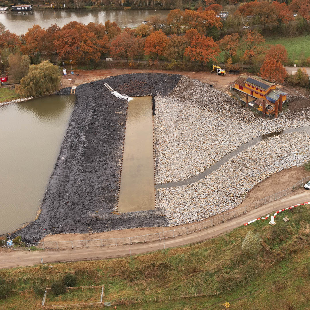 We zetten elektrisch en hybride materieel in, inclusief een mobiele gietasfaltcentrale in Haven Stein voor lokale productie. Daarnaast werken we circulair. We hebben ca. 15.000 ton stortsteen uit de noodmaatregelen her verwerkt in het ontwerp. Bovendien hebben we gebruikte stalen buispalen en damwanden toegepast.