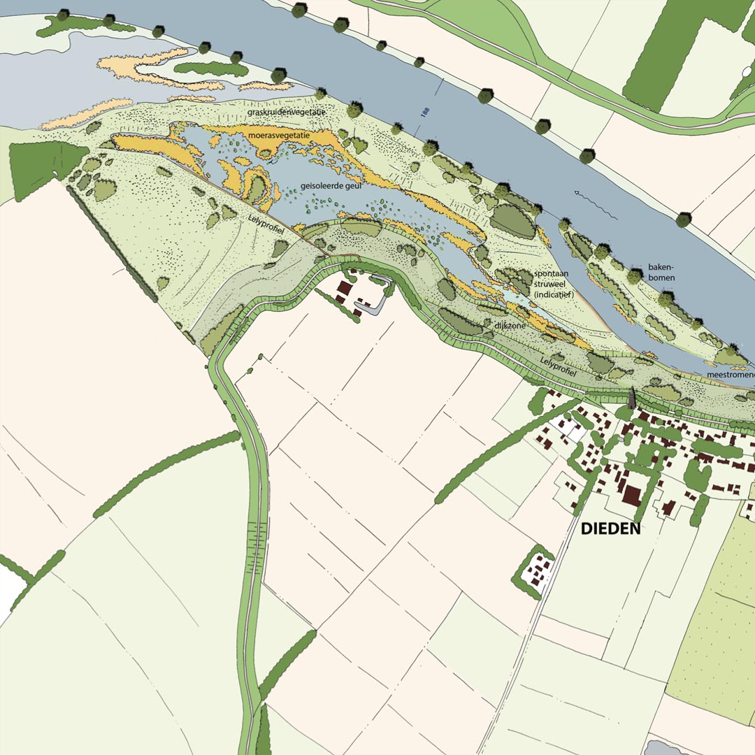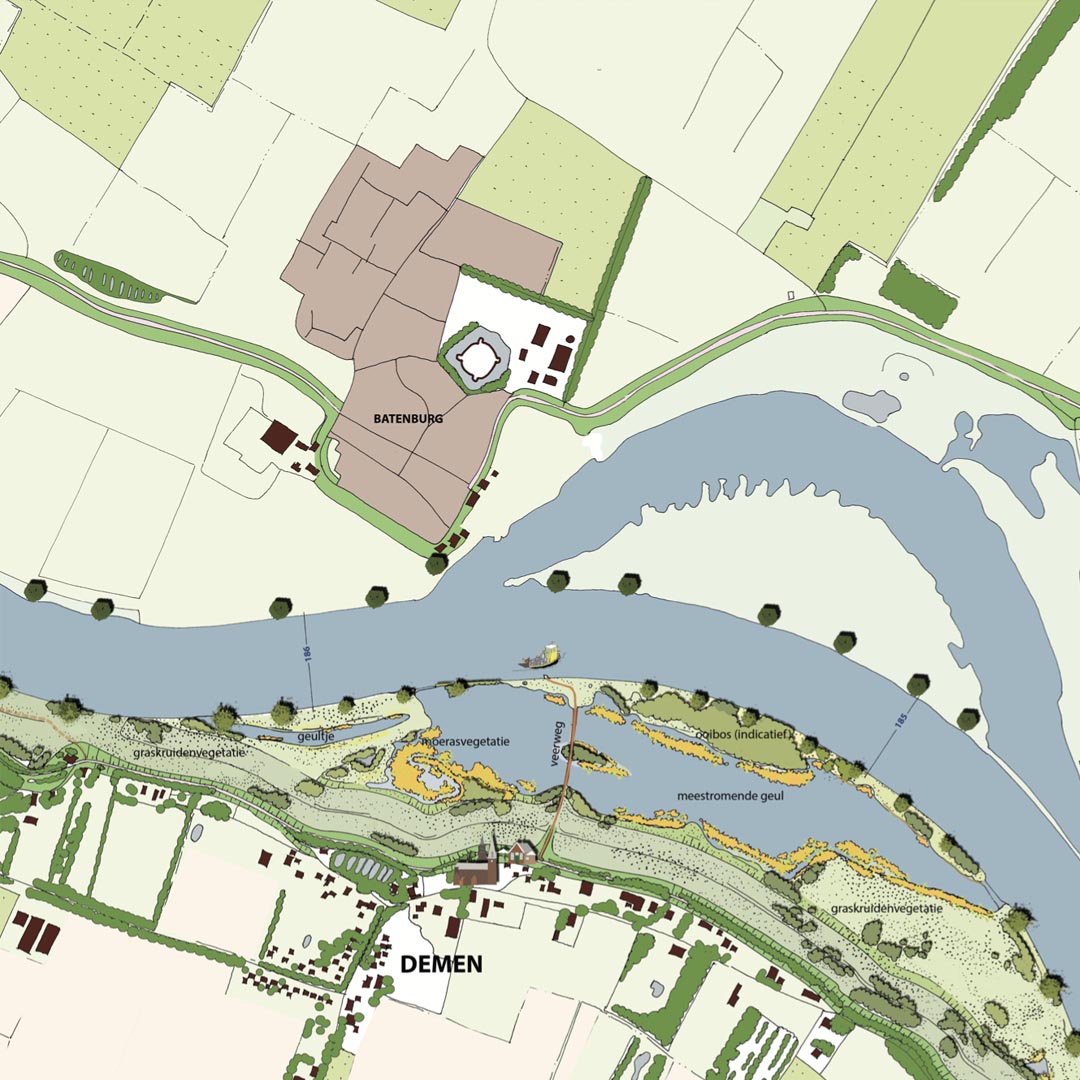 In een 110 hectare groot gebied tussen Demen en Dieden in de gemeente Oss gaan wij samen met Natuurmonumenten, K3, Rodruza en Rijkswaterstaat werken aan de ontwikkeling van de natuur in het gebied. Het plan is om de uiterwaarden tussen Demen en Dieden te verlagen en nevengeulen aan te leggen. Dat doen we door de kleilaag die er ligt (deels) af te graven. Dankzij deze ingrepen komt er weer ondiep water en meer variatie in het landschap. Zo versterken we de biodiversiteit en de ecologische waterkwaliteit van de Maas. Bovendien verkleint het de kans op overstromingen, wordt de rivier beter zichtbaar en is de natuur beter te beleven.